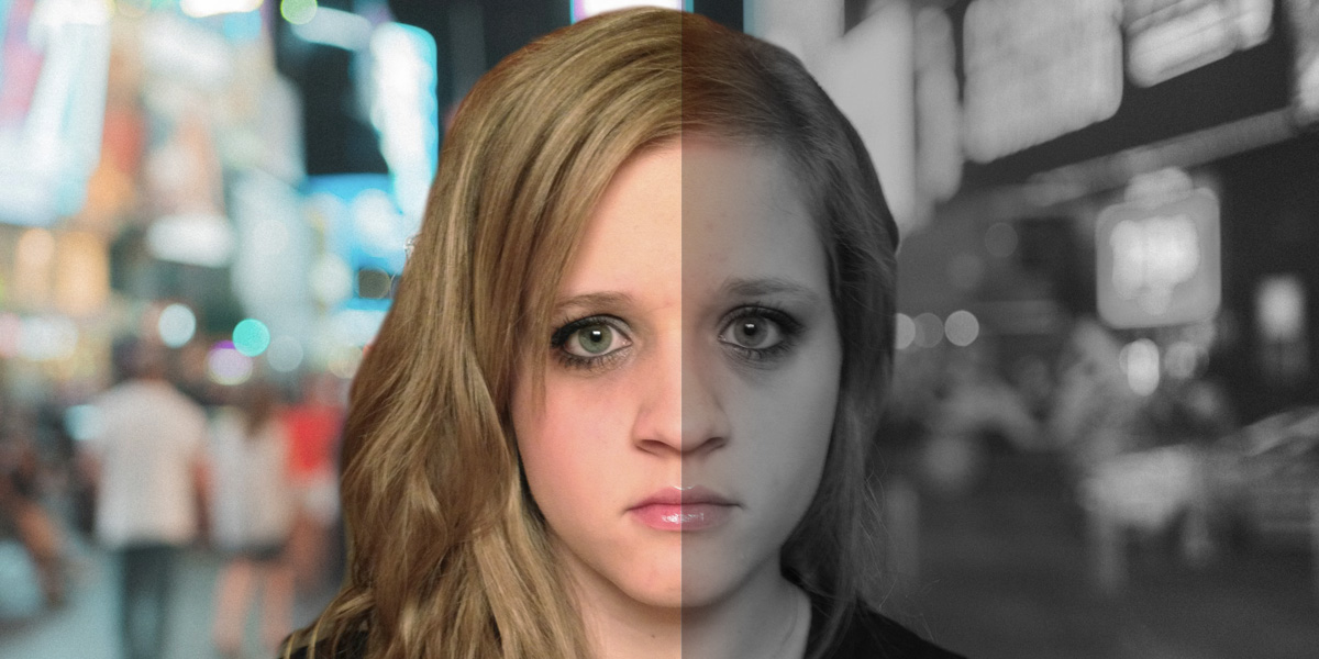 La cara de una mujer dividida, un lado en color y el otro en blanco y negro